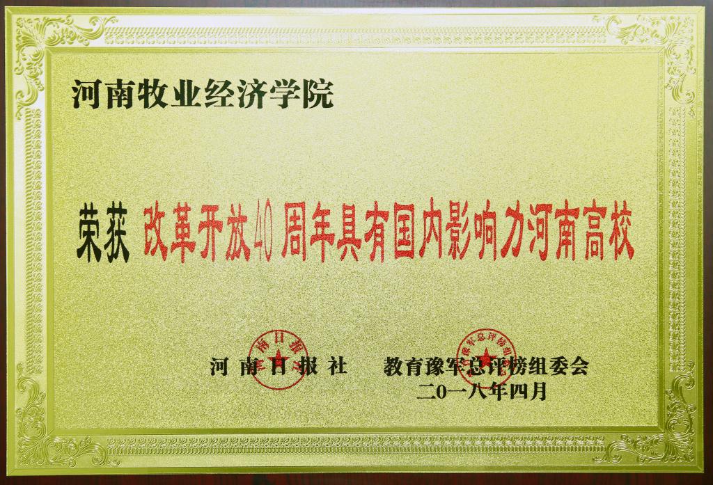 4月26日上午,由河南日报社主办的“第九届河南高等教育领军高校高峰论坛暨2018年度河南教育豫军总评榜”颁奖典礼在河南日报报业大厦举办,论坛发布了“改革开放40周年教育豫军总评榜”并进行了表彰,欧冠官网荣获“改革开放40周年具有国内影响力河南高校”。