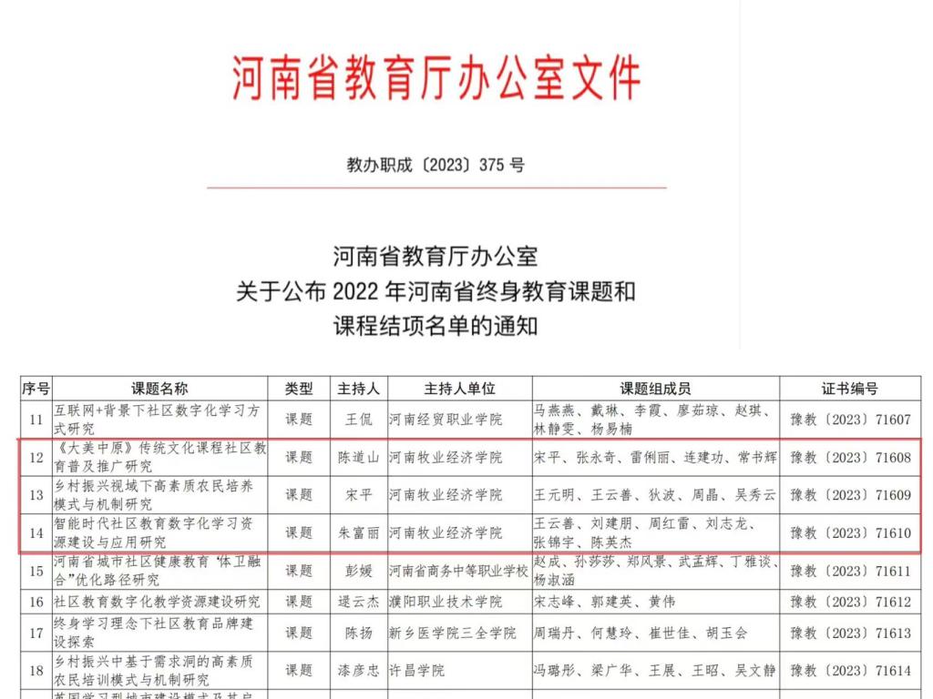 关于公布 2022 年河南省终身教育课题和课程结项名单的通知》(教办职成〔2023〕375 号)